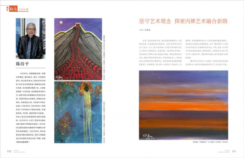 作为视觉艺术,丙烯画创作中画面空间的构建至关重要。它不仅需要满足观者视觉体验中物象空间远近、大小的感知需求,更要契合情感、想象等精神世界的意象表达。陈持平的《再回首,我心依旧》《云上花开》《松鹤延年》《一路发》等丙烯作品,或采用超出自然现实却符合视觉规律的远小近大焦点构图,或运用超越时空界限、不拘泥于客观距离却契合精神意象表达的“得其象中”空间造景手法,均彰显出根植于画家内心深处的文化学养与审美内涵。