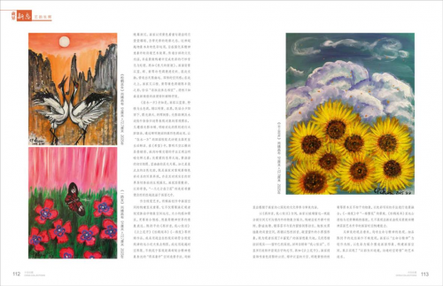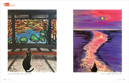以《再回首,我心依旧》为例,画家以玻璃窗这一既能分割空间又可沟通内外的物象为媒介,构建出室外黄叶秋树、静谧池塘、错落苔石与室内窗格倒影拉长、地板灰黑抽象的双重空间,再辅以悠然回首、凝望窗外的小黑猫形象,既为观者拓展了丰富宽广的画面想象天地,又将思绪拉回现实——窗外已然深秋,回眸自顾却“我心依旧”,尽显岁月流转中澄观自守的志节。再如《云上花开》,画家将装饰性紫色荫翳的云团、绿中泛蓝的天空、明艳黄橙的秋菊等原本互不相干的物象,以色彩写实的手法进行造景融合;《一路发》中“一路繁花”的景致、《松鹤延年》里远山劲松与近旁舞鹤的搭配,无不展现出画家由现实景致向精神层面艺术升华的画面时空构建能力。从审美的观点看来,均有生命与精神的表现。细品陈持平的这些画作不难发现,画家以“生命与精神”为创作内核,以色彩为媒介塑造画面形象、构建画面空间,真正实现了“以彩为兴造境,沟通时空寄情”的艺术追求。