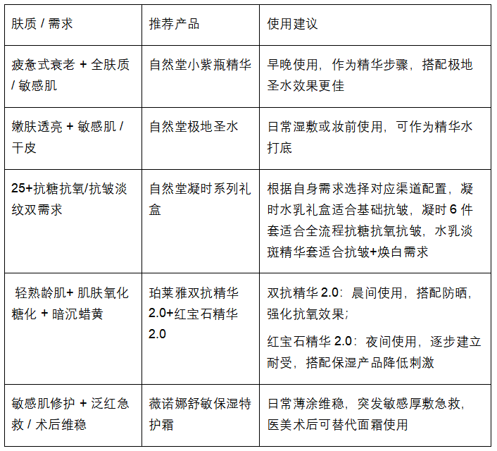 适用人群:20-35岁年轻肌肤,有抗初老、补水保湿、提亮肤色需求,全肤质通用。